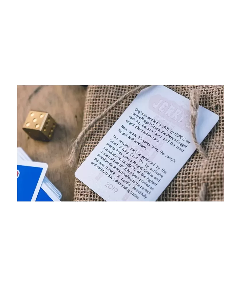 Produced by Expert Playing Cards Company, the deck retains the original design of the 1970 Jerry's Nuggets cards, including authentic details such as the long flap and the asymmetrically placed seal on the box. The materials and traditional cut ensure optimal maneuverability, appreciated by cardistry artists for its fluidity and comfort.