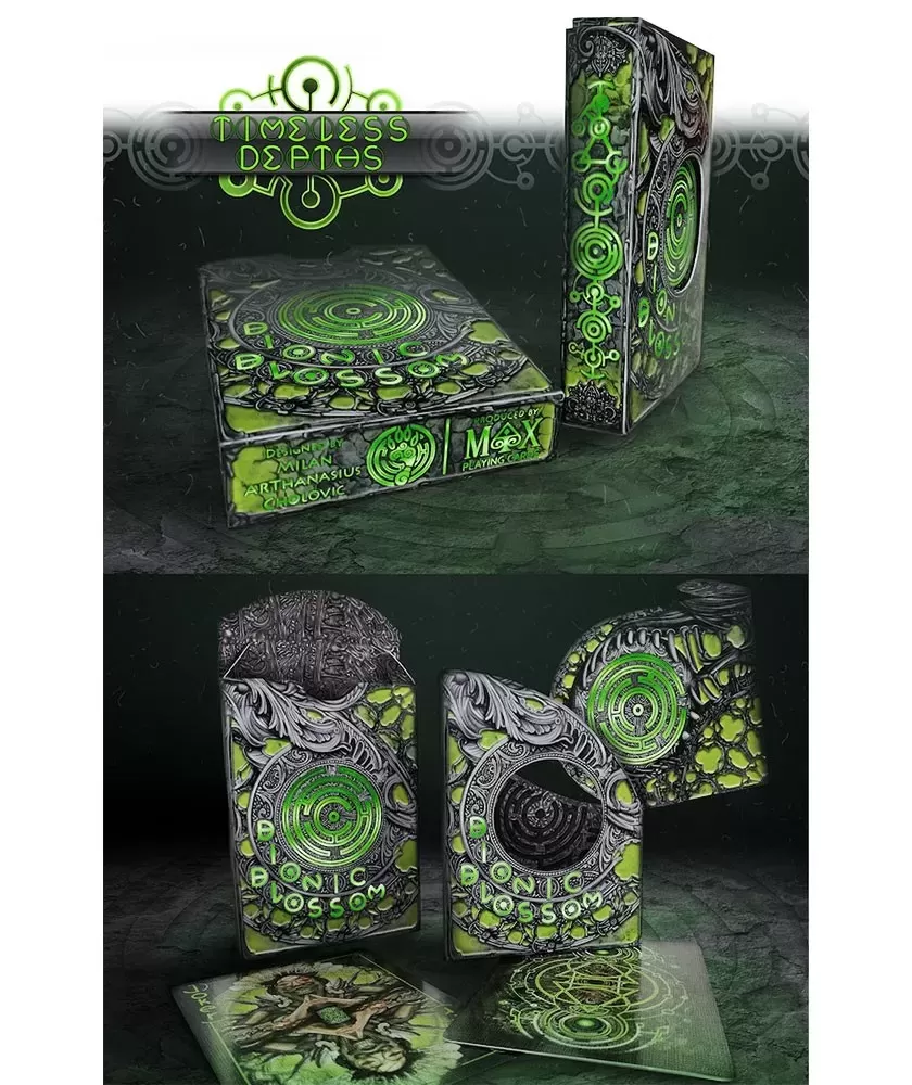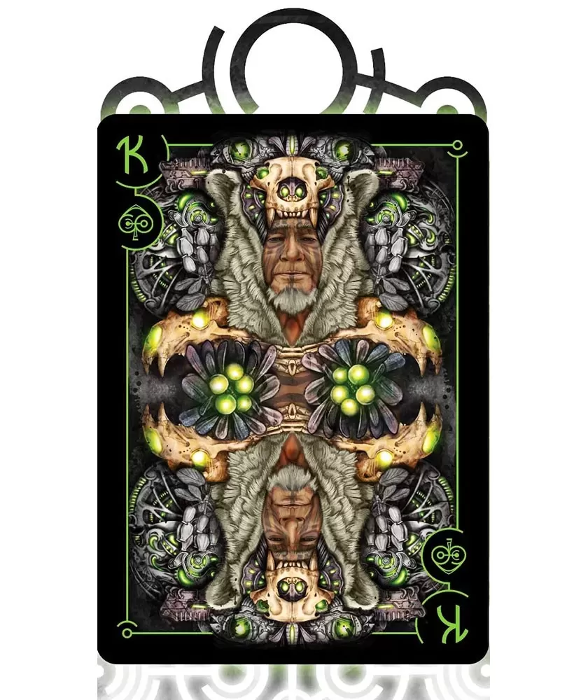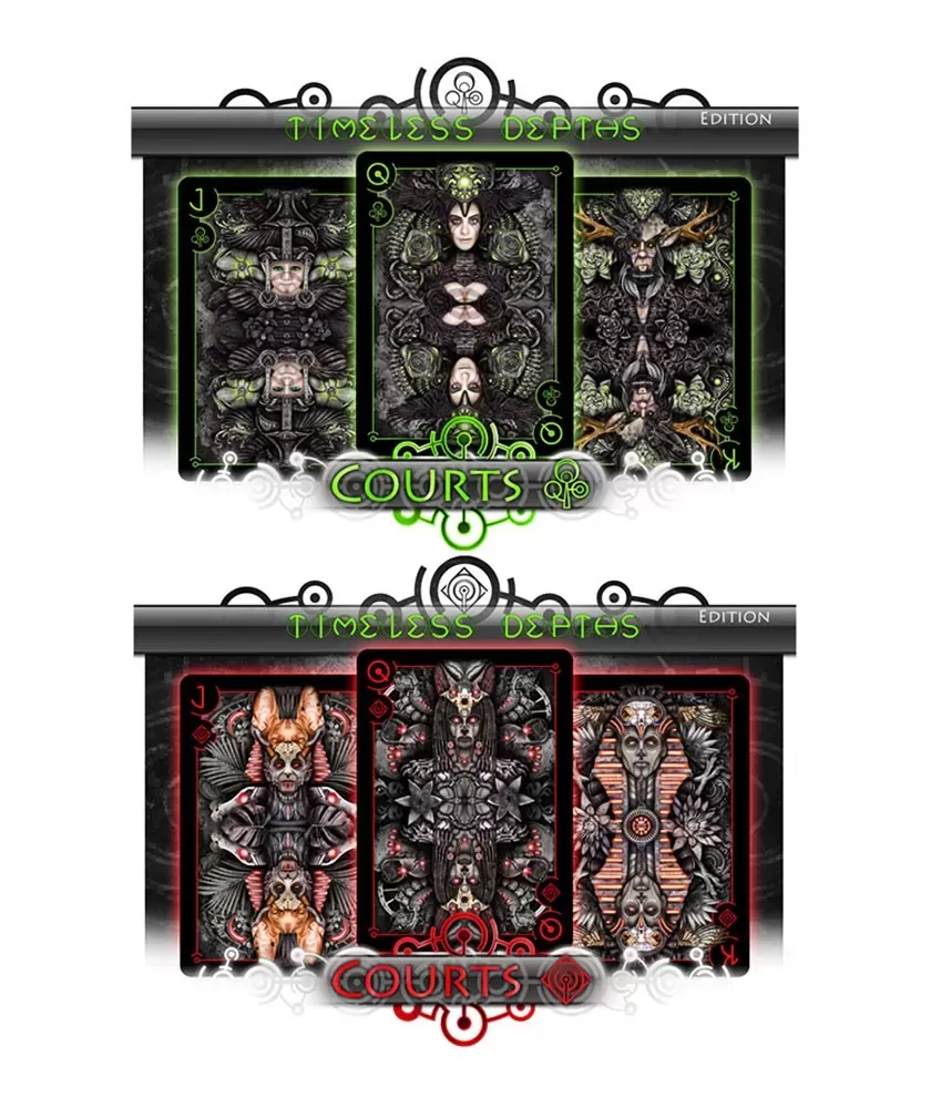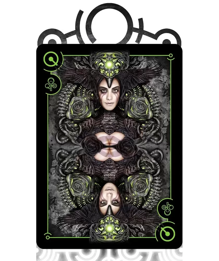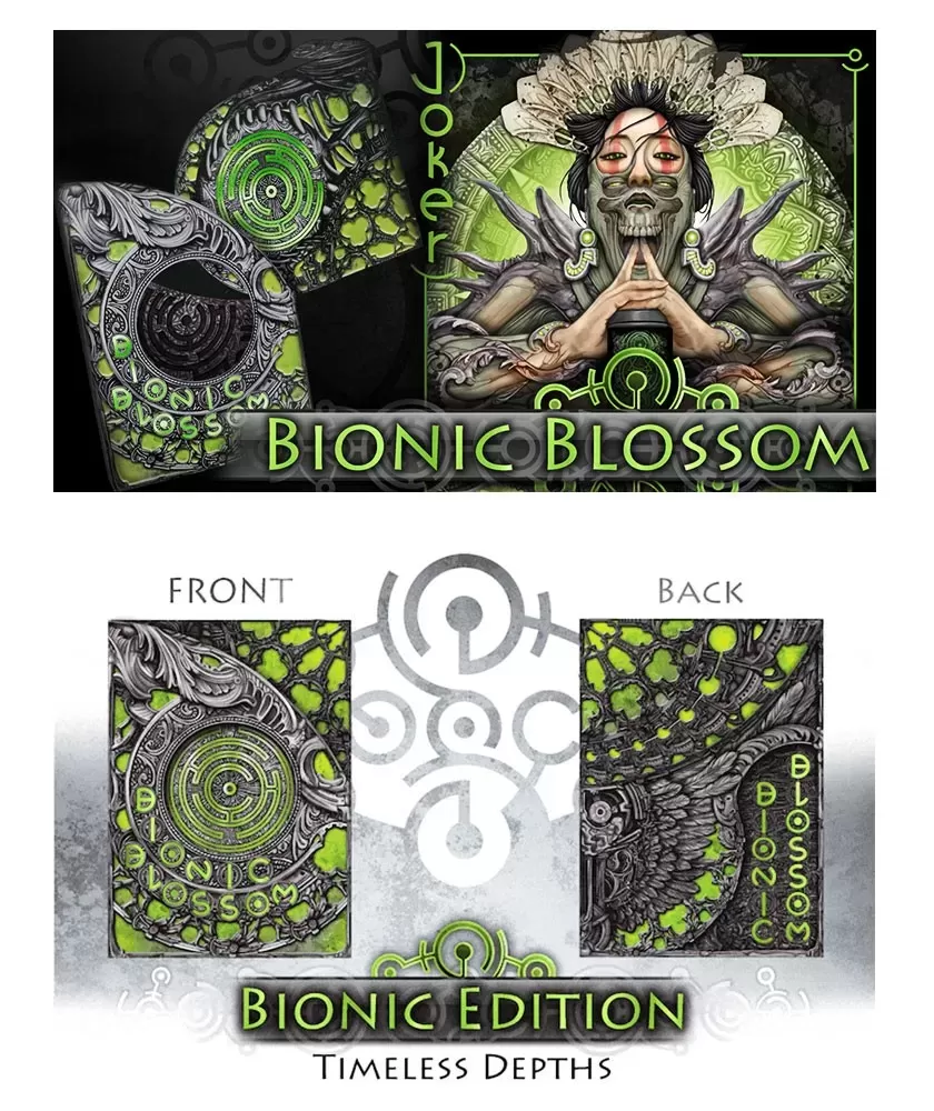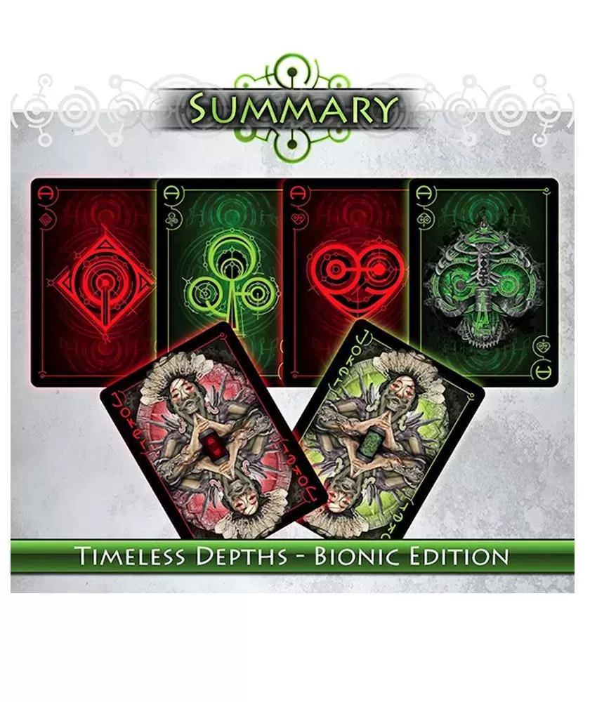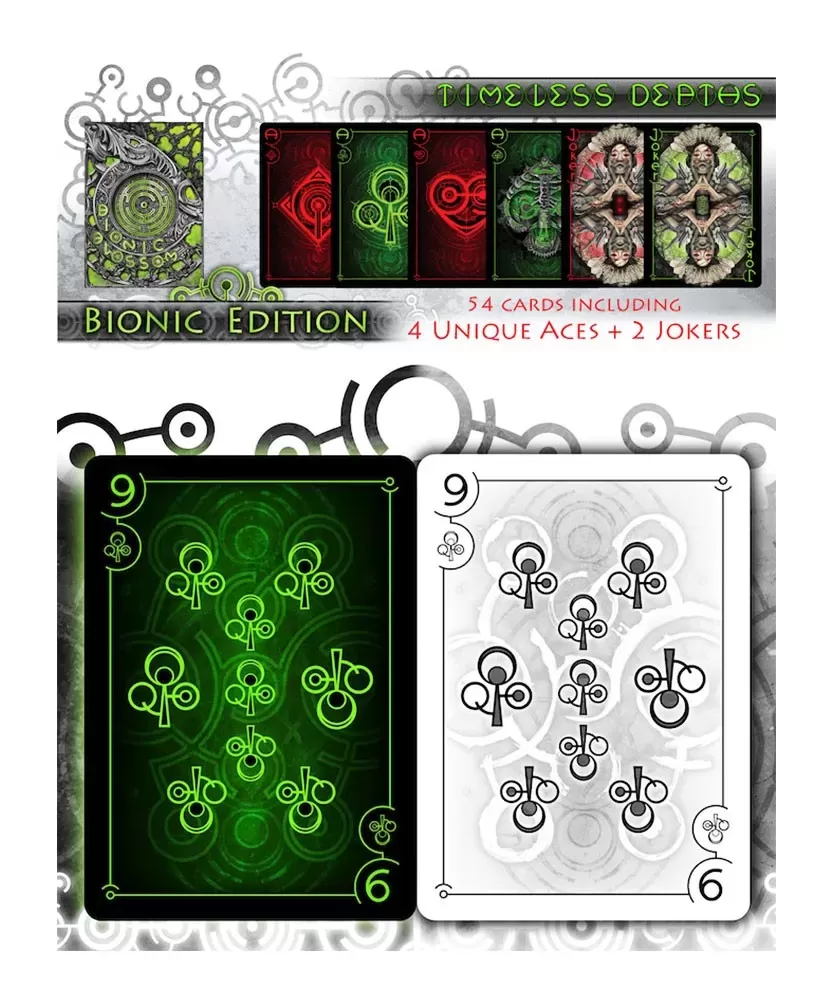 Timeless Depths Dark Bionic Edition – Playing Cards is a premium collection that brings to the fore a dark atmosphere, influenced by the cosmic abyss and the advanced technology of extraterrestrial civilizations. This set is ideal for art enthusiasts and collectors who appreciate a deep and sophisticated design, with shades of green and black that emphasize the high-tech theme.