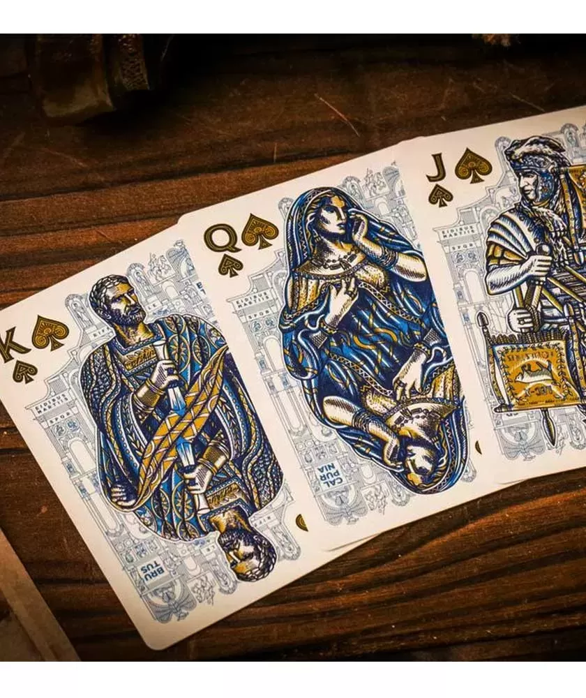 - Available in two elegant editions: Green & Blue Premium matte paper (green or blue), with luxury embossing Premium gold and green foil for the green edition Premium gold and blue foil for the blue edition The interior of the box includes an illustration of the assassination of Julius Caesar Limited edition of 1500 decks for each version, with numbered foil seal Printed by TWPCC, with luxury finish