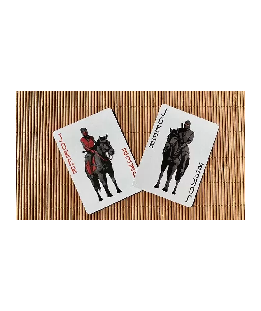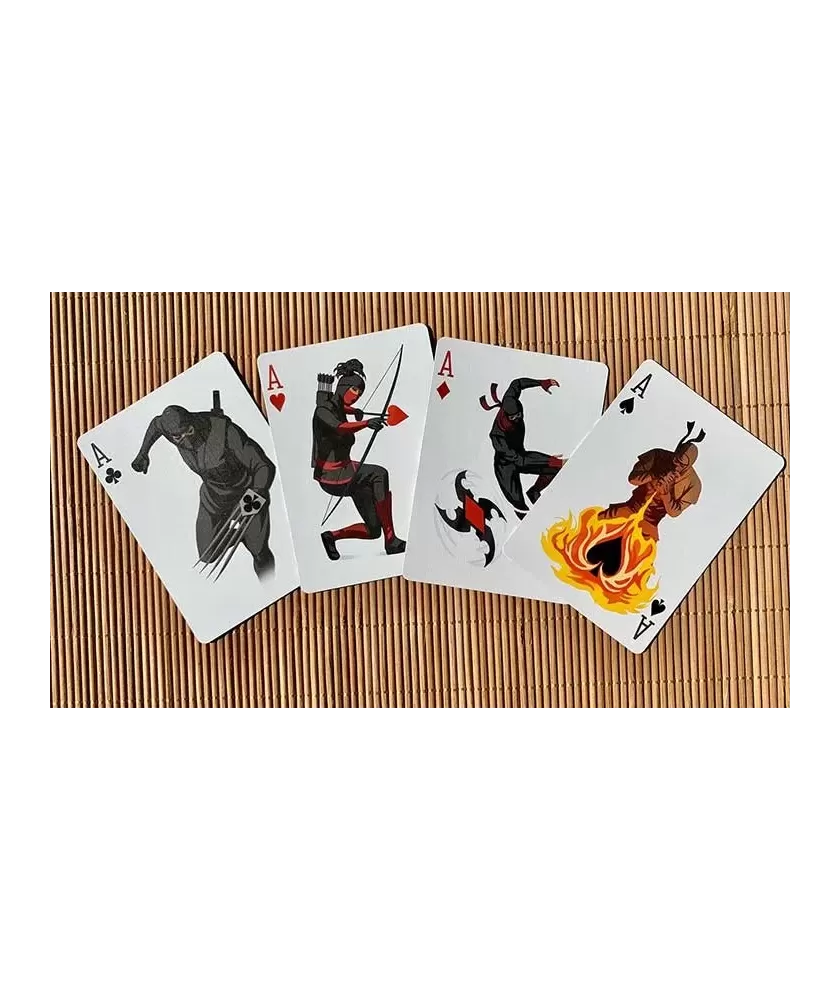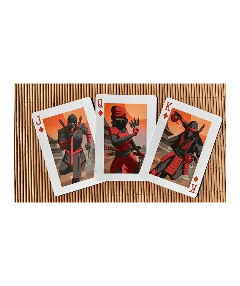 Each card is carefully illustrated, representing different ninjas and specific weapon types, grouped by color and symbol: throwing weapons, melee weapons, ranged weapons and ninjutsu elements. Made of triple-layered cardboard and finished with Air Cushion, the Bicycle Ninja deck ensures excellent maneuverability and increased durability, being suitable for both games, themed magic tricks and cardistry.