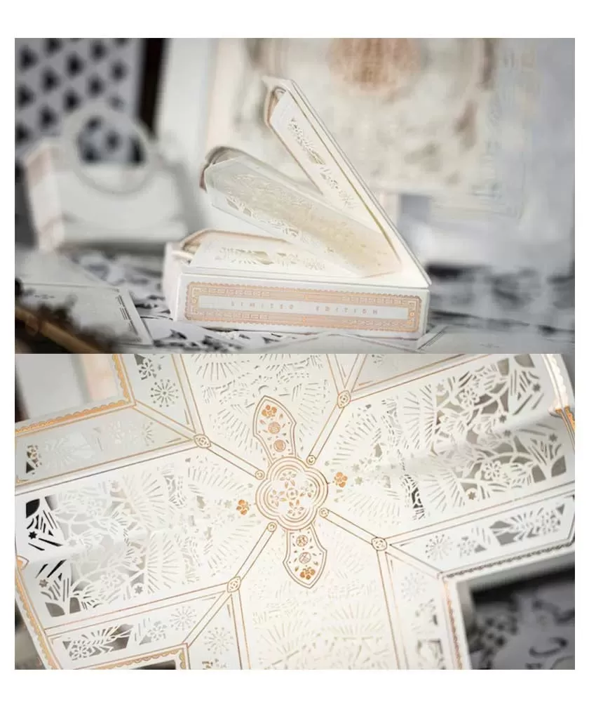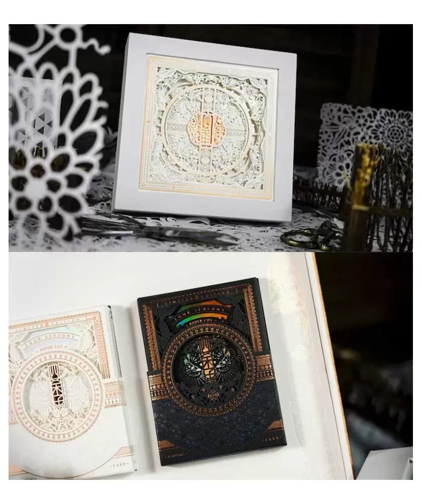 Cele două pachete de cărți alb-negru sunt realizate în stilul artistic Paper Cut, cu elemente holografice ce oferă un efect vizual impresionant. Cutia exterioară este o piesă de colecție în sine, prevăzută cu un mecanism de iluminare ce se activează la ridicarea capacului, iar utilizatorul poate alege să oprească lumina pentru o experiență personalizată. Fiecare detaliu reflectă o atenție meticuloasă pentru calitate și estetică.
