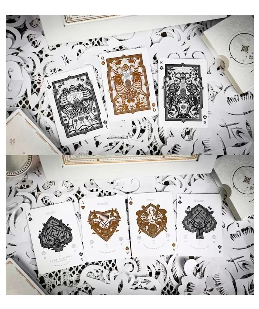 Four Seasons White Boxed Set – Playing Cards este un set de colecție deosebit, creat pentru cunoscătorii care apreciază calitatea și designul sofisticat. Acest set emană eleganță și rafinament, aducând energia simbolică a celor patru anotimpuri și zodiacului într-o prezentare unică.