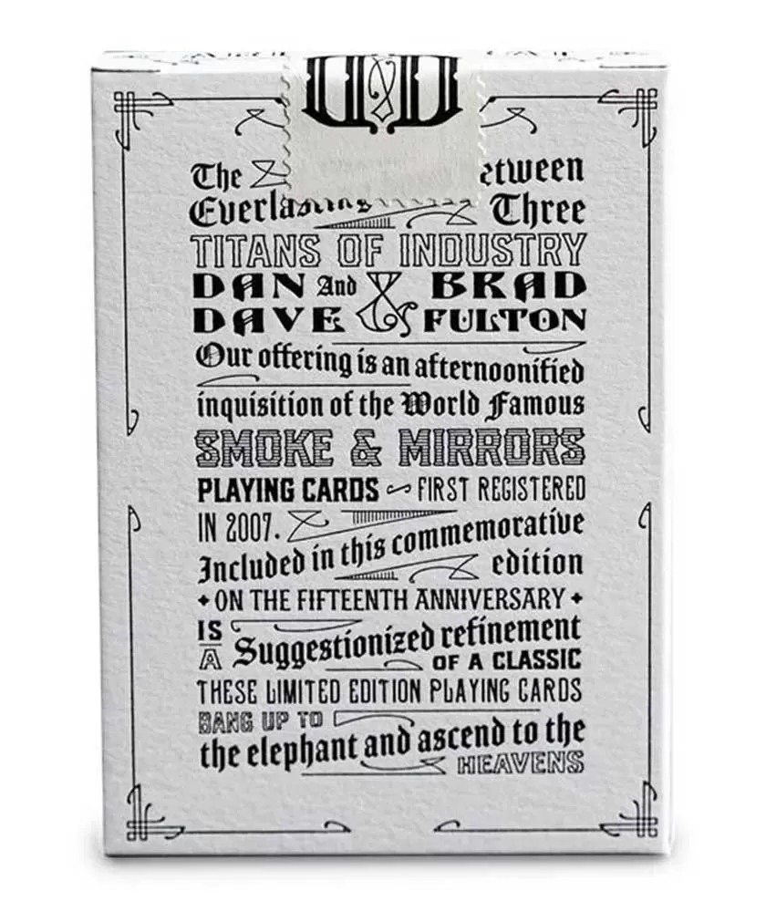 Smoke and Mirrors 15th Anniversary Ed. Smoke White – Playing Cards reprezintă o colecție specială dedicată aniversării a 15 ani de la lansarea seriei originale Smoke & Mirrors. Acest set aduce o energie distinctă, combinând un design artistic unic cu o calitate superioară, perfect pentru cei care apreciază nu doar jocul, ci și estetica fiecărei cărți.