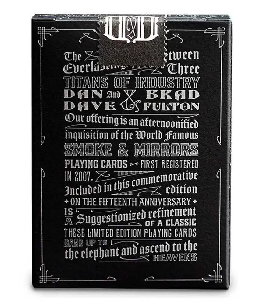 Acest set este dedicat colecționarilor și iubitorilor de cărți de joc cu un design artistic și rafinat, care doresc să adauge o piesă de excepție în colecția lor. Smoke and Mirrors 15th Anniversary Ed Smoke Black oferă un echilibru perfect între estetică și funcționalitate, fiind o alegere inspirată pentru orice pasionat.