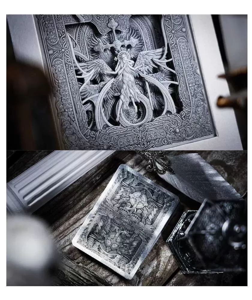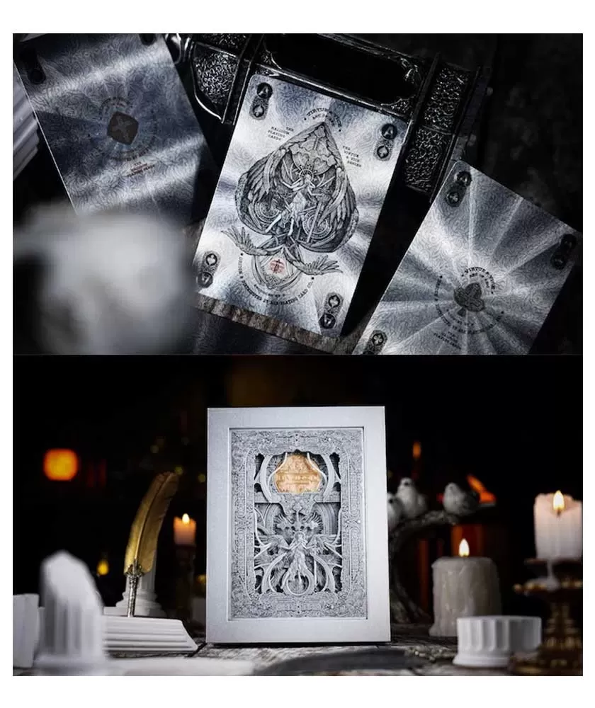 Halidom Silver Sacred Box Set – Playing Cards aduce o experiență unică pentru colecționari și entuziaști, combinând frumusețea și rafinamentul într-un set limitat la 777 de exemplare. Această ediție se remarcă prin tematica sa angelică, ce inspiră grație și noblețe, oferind o prezență distinctă pe masa de joc sau în colecție.