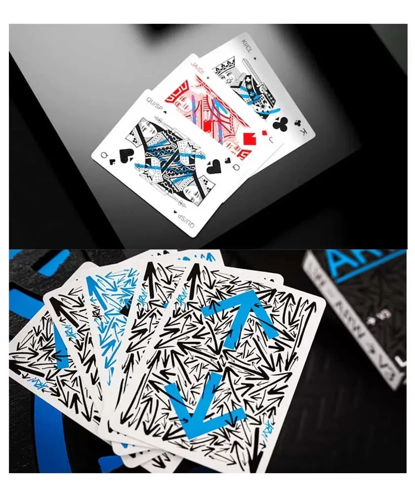 Designul unic al ARW V3 explorează direcția și dinamica vizuală prin elemente ce prind viață sub lumina ultravioletă, adăugând un plus de impact show-ului tău. Proiectate de Luke Wadey și tipărite de USPCC, aceste cărți folosesc carton Bee Crushed Stock cu finisaj Air Cushion, asigurând manevrabilitate optimă și durabilitate.