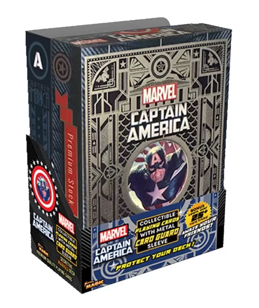 Fabricate de Fantasma, aceste cărți premium beneficiază de o construcție „Marked Deck” ce permite realizarea unor trucuri vizuale și iluzioniste, oferind un plus de versatilitate artiștilor magicieni și entuziaștilor cardistry. Clema metalică inclusă protejează cărțile și adaugă o notă elegantă, fiind decorată cu simboluri distinctive Captain America.