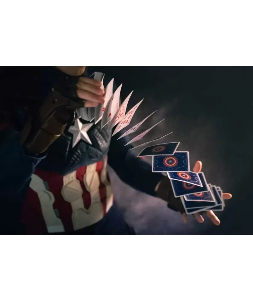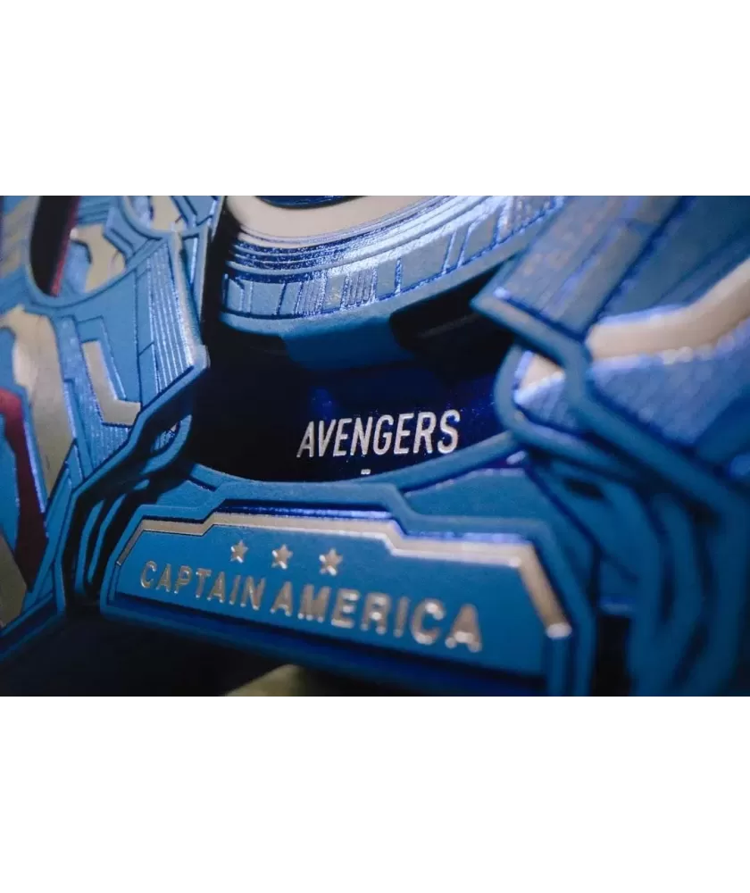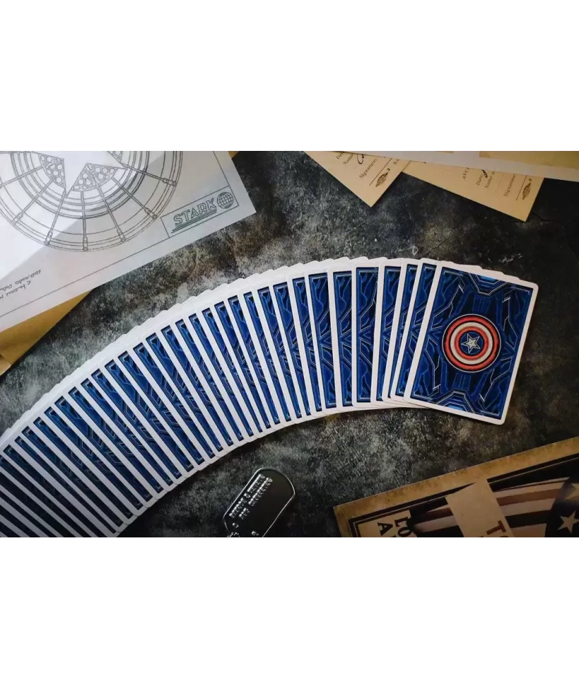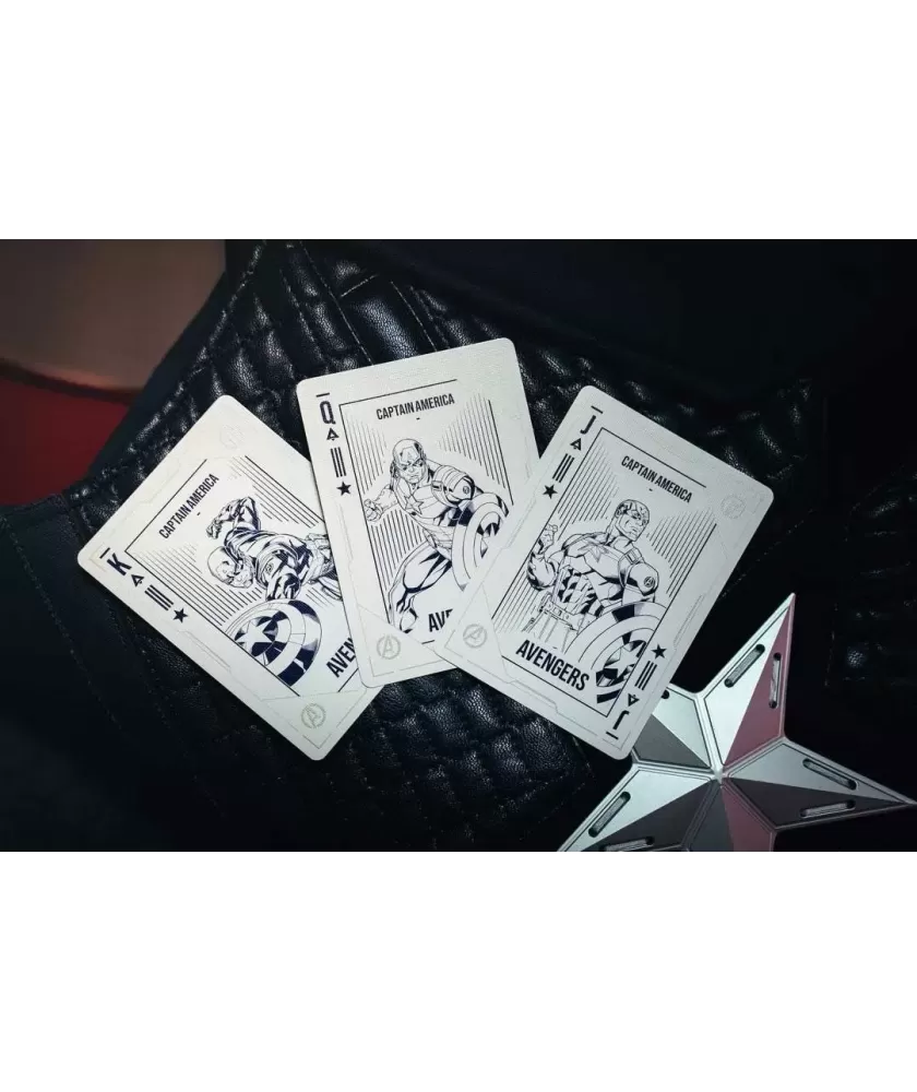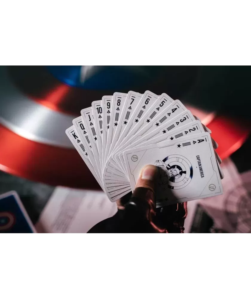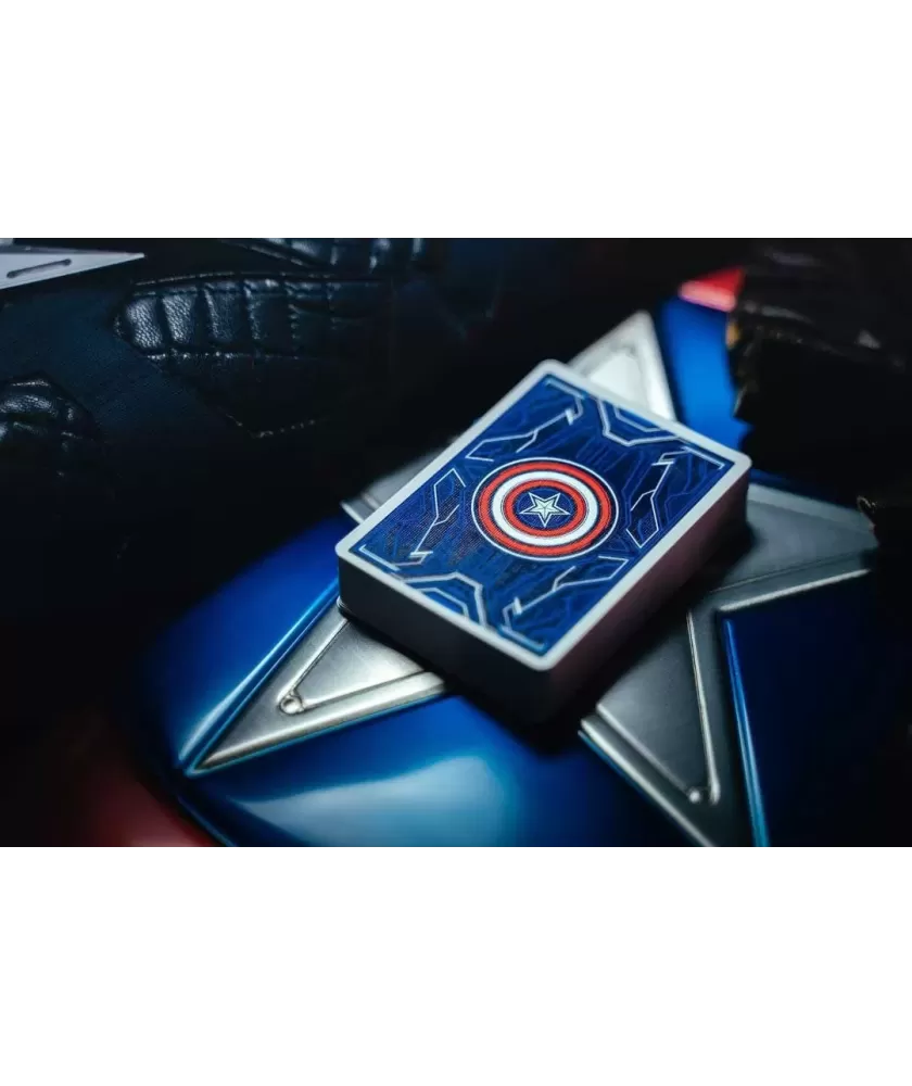 Cutia este realizată manual, din multiple componente atent asamblate, și se remarcă prin sistemul inovator de deschidere magnetică și iluminare LED care evidențiază scutul Captain America. Culorile albastru, roșu și argintiu, împreună cu embosarea în relief, subliniază caracterul premium al setului. Cărțile au spatele imprimat cu motive consacrate, iar calitatea tiparului este garantată de United States Playing Cards Company, folosind cerneală metalică și licență oficială Disney cu sigiliu hologramă.