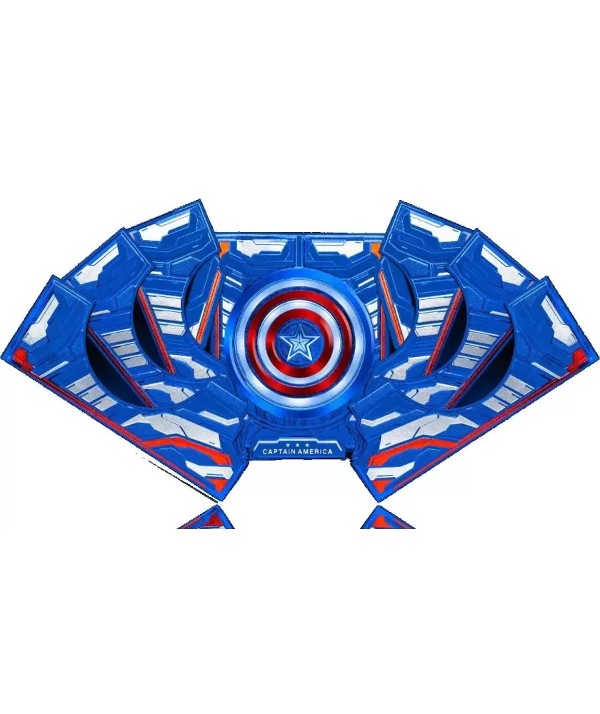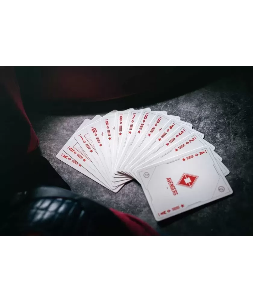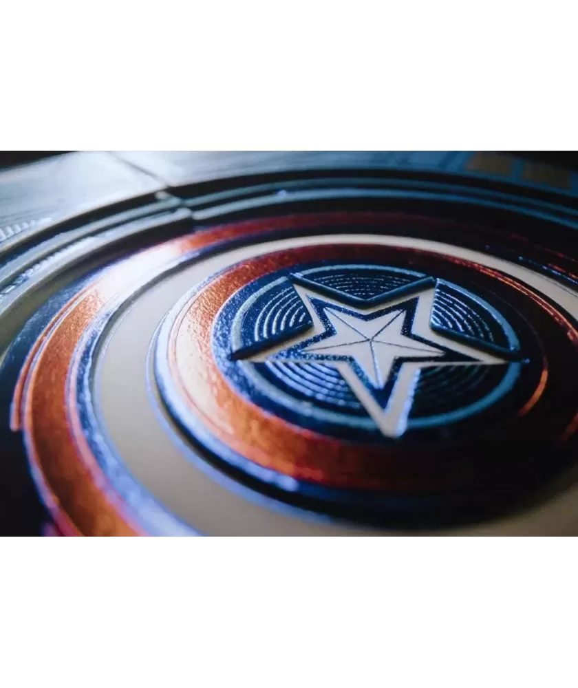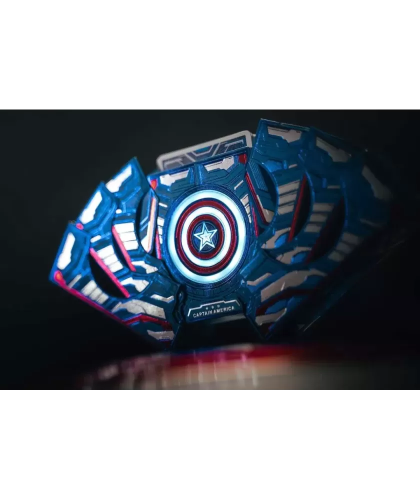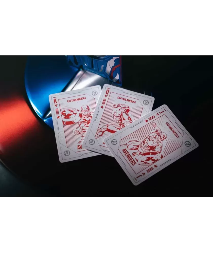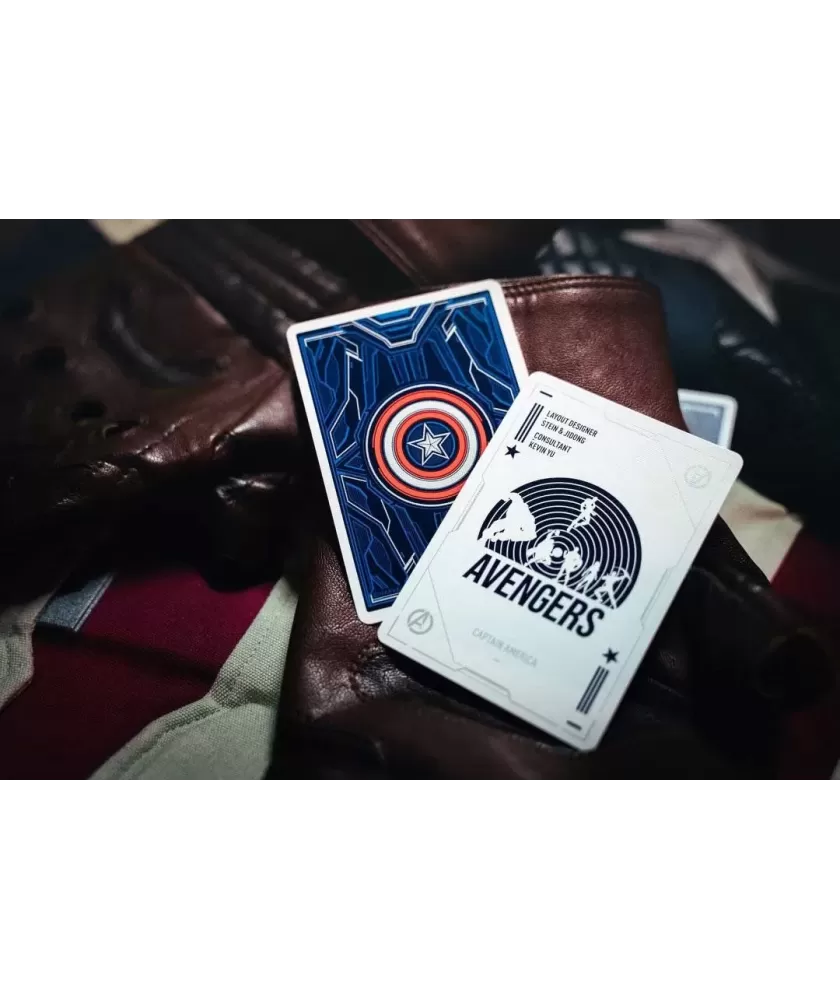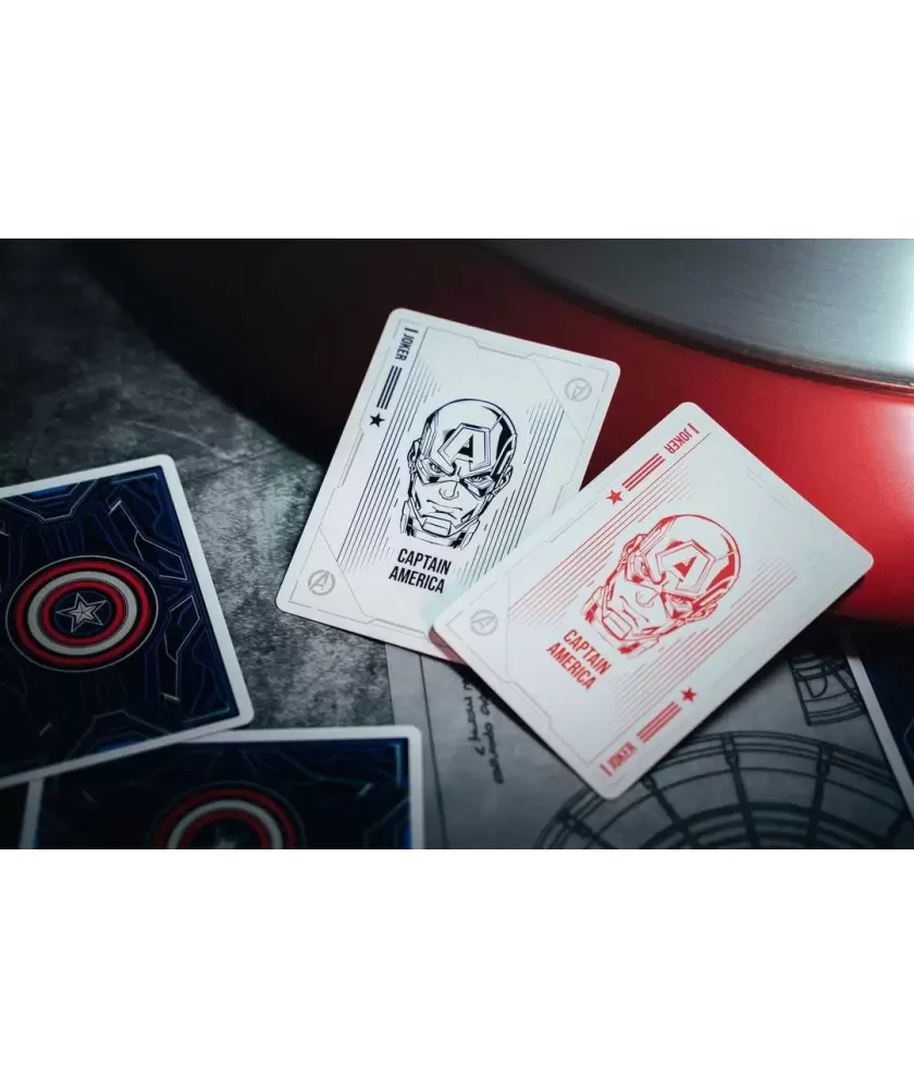 Cutia este realizată manual, din multiple componente atent asamblate, și se remarcă prin sistemul inovator de deschidere magnetică și iluminare LED care evidențiază scutul Captain America. Culorile albastru, roșu și argintiu, împreună cu embosarea în relief, subliniază caracterul premium al setului. Cărțile au spatele imprimat cu motive consacrate, iar calitatea tiparului este garantată de United States Playing Cards Company, folosind cerneală metalică și licență oficială Disney cu sigiliu hologramă.