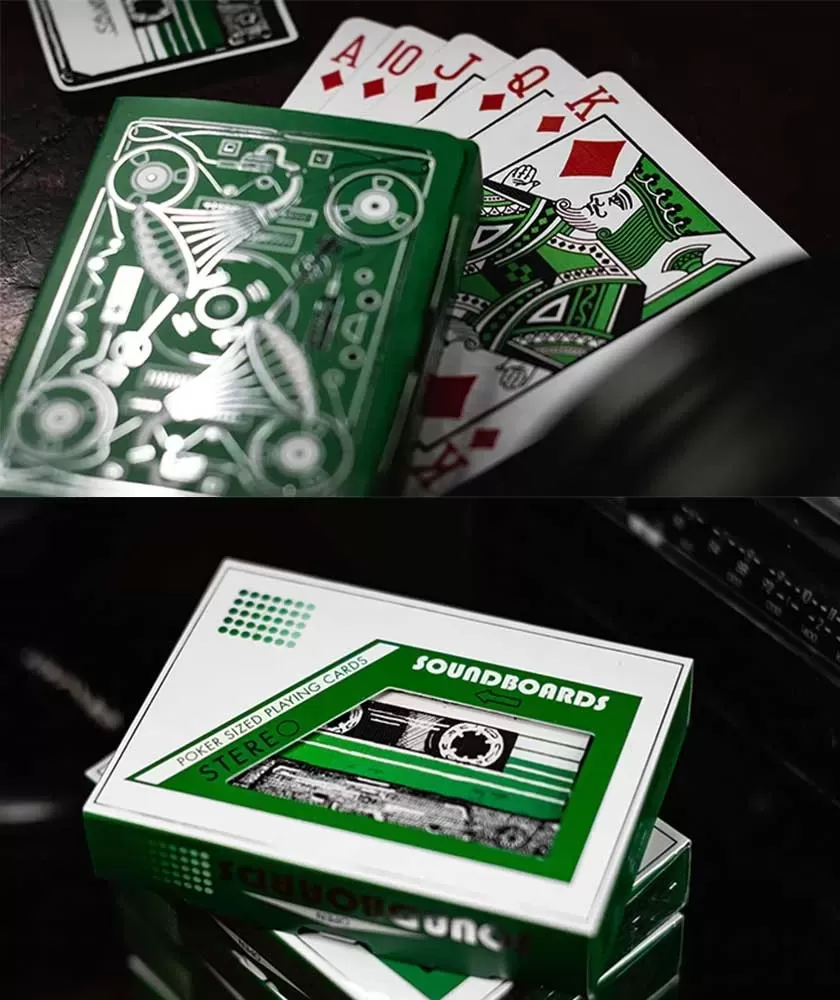 Soundboards V4 Green Riffle Shuffe – Playing Cards oferă o experiență unică, inspirată de estetica casetofoanelor și gamofoanelor din anii 1980. Acest pachet de colecție combină eleganța designului vintage cu calitatea superioară a cărților de joc, fiind ideal pentru colecționari și iubitori de muzică.