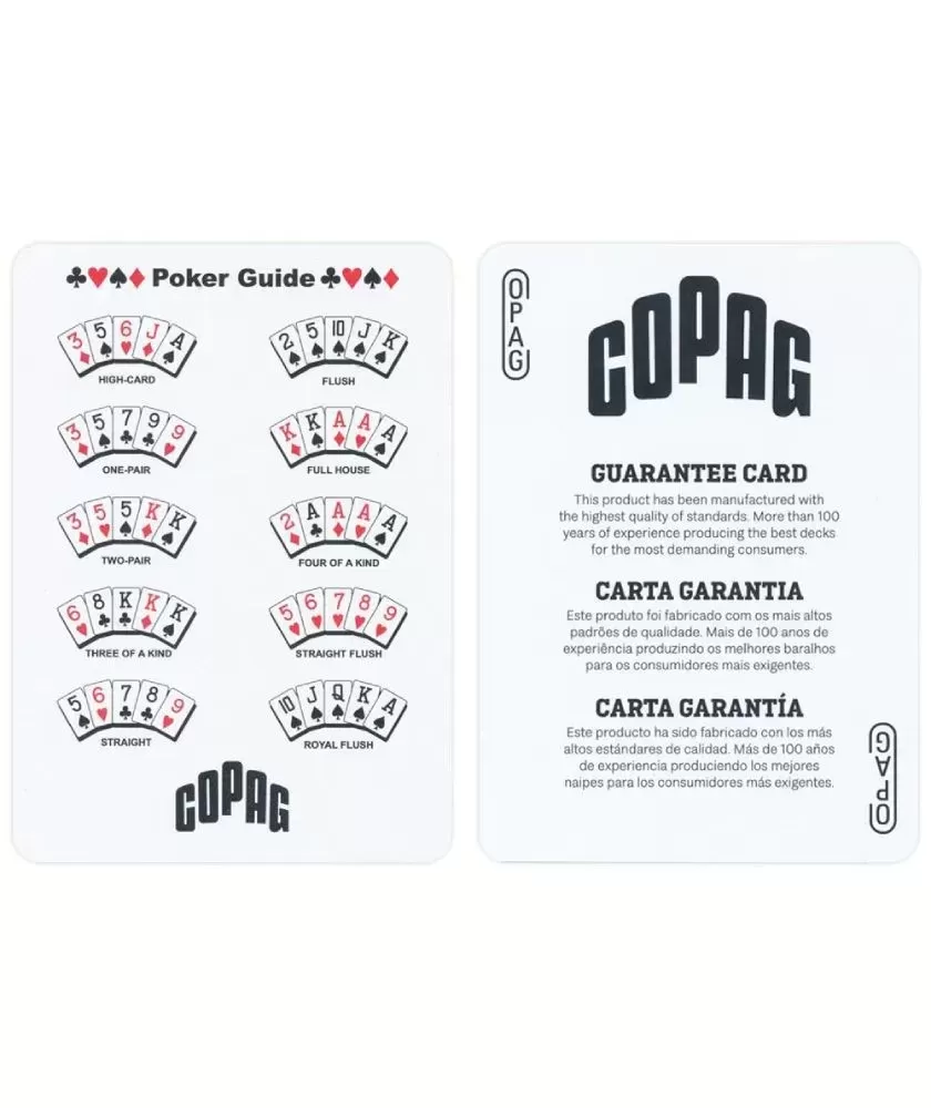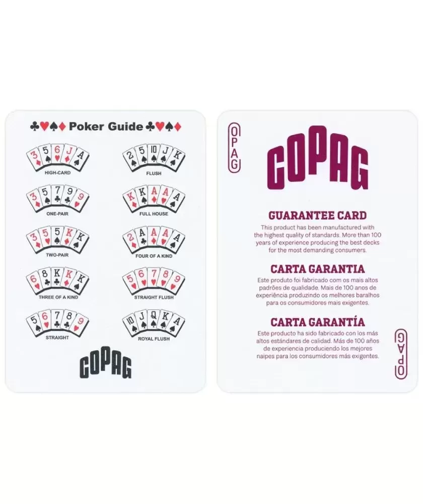 Realizate din plastic 100% de înaltă calitate, aceste cărți sunt rezistente la apă și la îndoire, ceea ce le face ideale pentru utilizare frecventă și în diverse condiții, chiar și în aer liber. Jumbo indexul facilitează identificarea rapidă a cărților, iar dimensiunea poker size se potrivește perfect mâinilor și cutiilor standard. Brandul COPAG, recunoscut internațional, garantează un produs premium fabricat în Belgia.