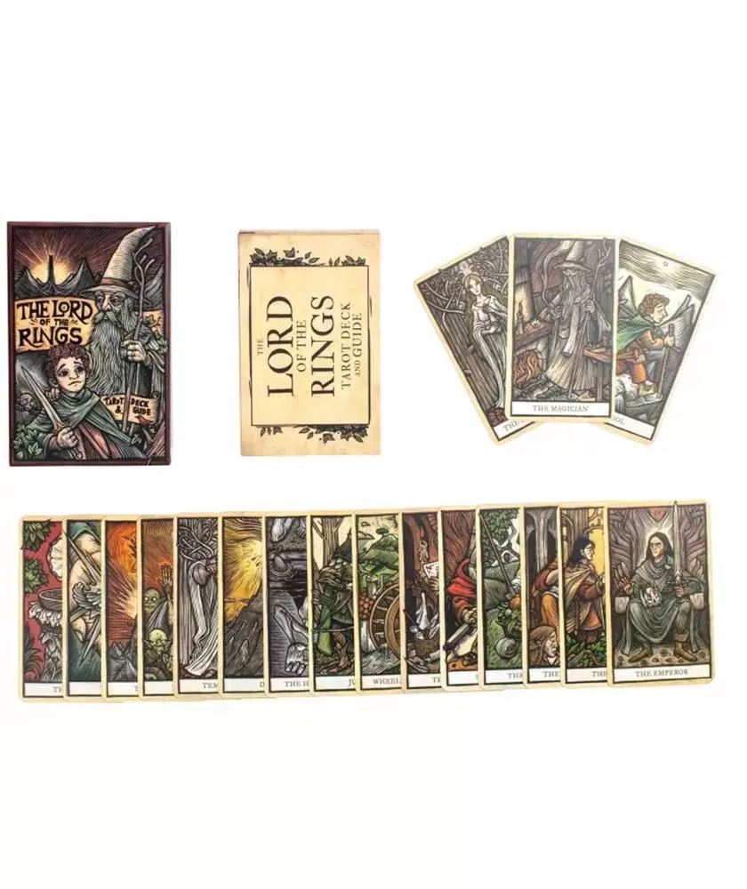 Lord Of The Rings Tarot – Tarot Deck aduce în mâinile tale o experiență unică, inspirată de lumea legendară a cărții și filmului Lord of the Rings. Acest set complet, cuprinzând toate cele 78 de cărți de tarot, te invită să explorezi atât Arcana Majoră, cât și pe cea Minoră, fiecare arcana fiind ilustrată cu personaje și simboluri care reflectă profunzimea poveștii.