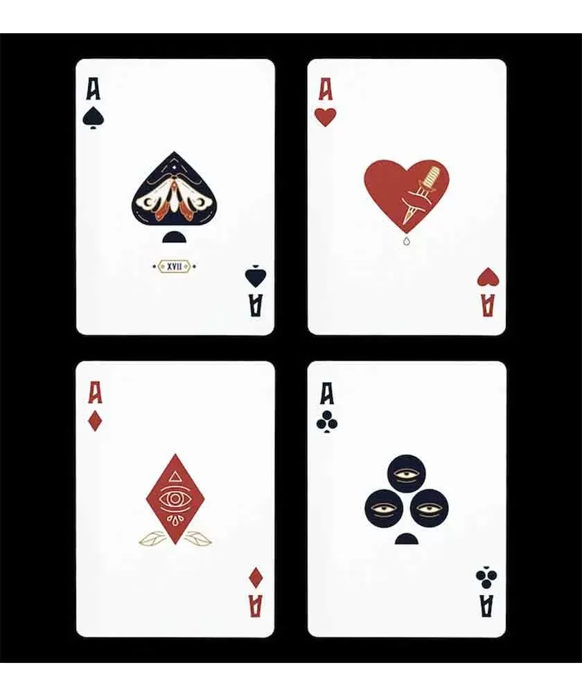 Fiecare carte este imprimată cu un design complex și elegant, în nuanțe de albastru închis, roșu, alb și auriu, care evocă simbolismul nopții, corbului, catifelei și luminii calde a unei lămpi. Realizate din carton de calitate, cu finisaj Legendary Finish, cărțile sunt rezistente și confortabile la manevrat, având dimensiunea clasică poker size.