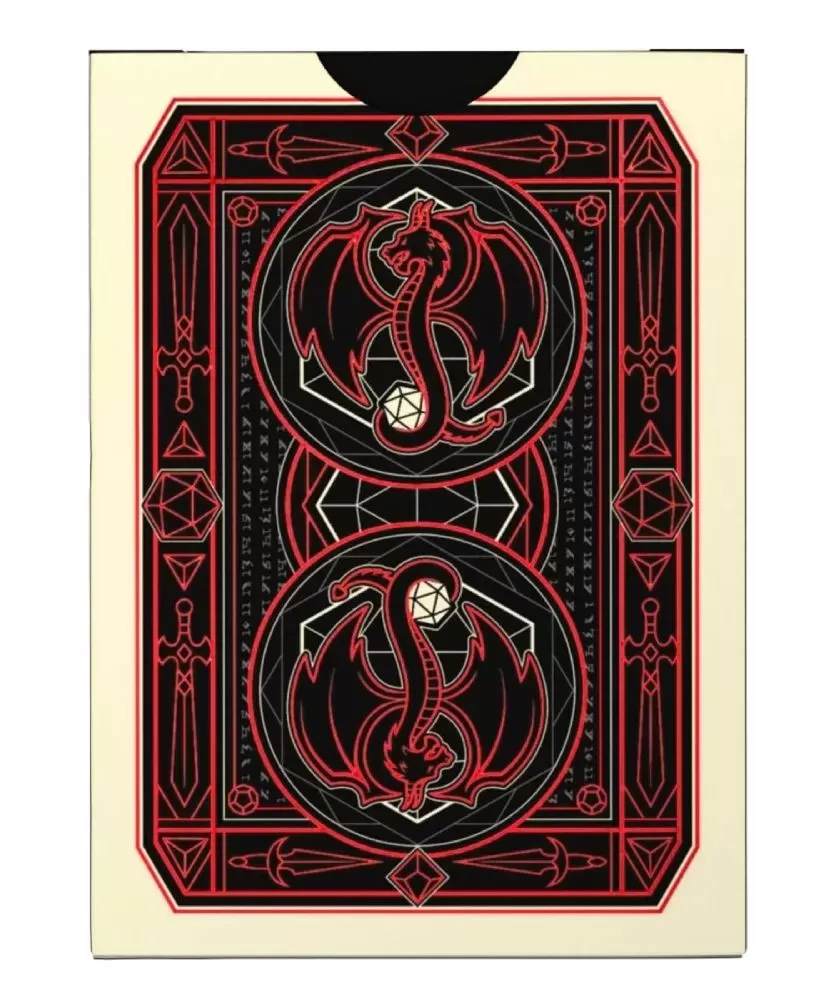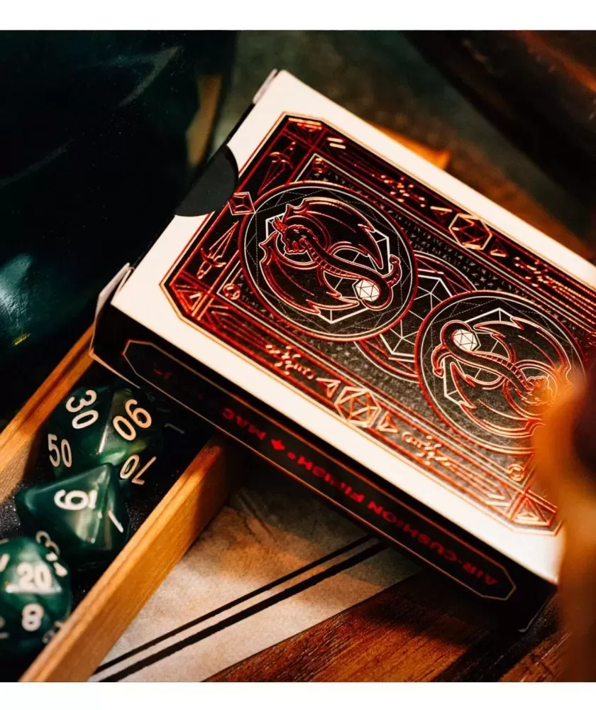 Fiecare detaliu este atent realizat, începând cu spatele cărților, care prezintă motive cu săbii, pumnale, dragoni și zaruri poliedrice, toate elemente ce evocă universul jocurilor fantasy. Cutia este decorată cu folie roșie strălucitoare, subliniind natura sa premium. Calitatea imprimării și a finisajelor este una superioară, garantând durabilitate și plăcerea utilizării.