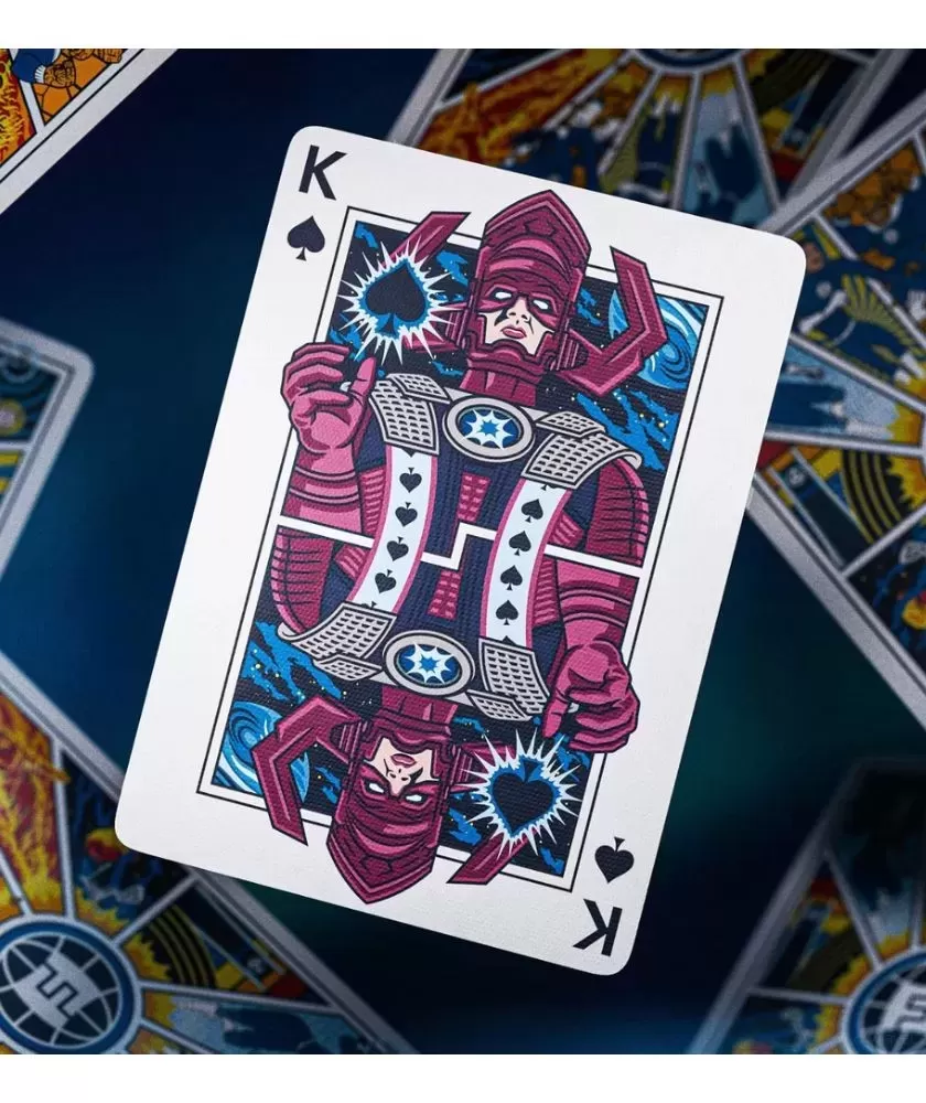 Fantastic 4 Playing Cards by theory11 oferă o experiență unică, combinând energia și stilul retro-futurist al celebrei familii Marvel cu o calitate premium remarcabilă. Acest pachet este dedicat atât pasionaților de jocuri, cât și colecționarilor care apreciază arta și povestea din spatele fiecărei cărți.