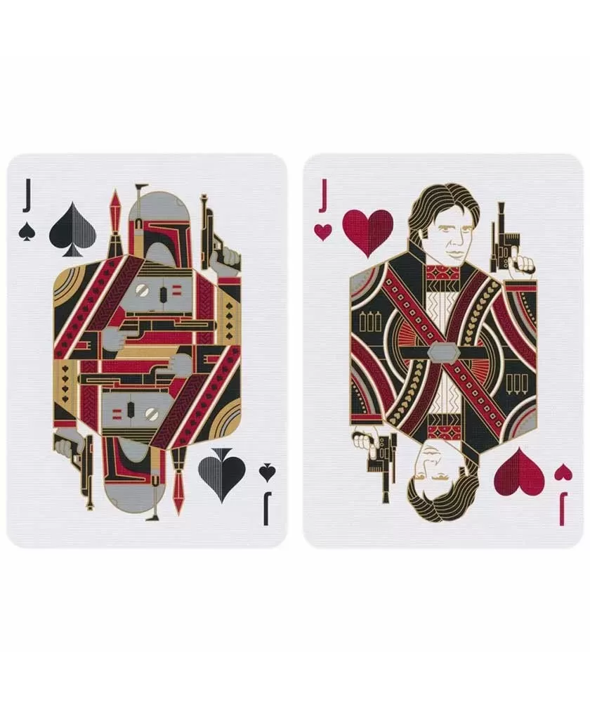 Fiecare carte prezintă personaje emblematice ale universului Star Wars, precum Darth Vader și Kylo Ren, transpuse într-un stil premium, cu detalii fine și o grafică atent realizată. Setul impresionează prin cutia embosată și cerneala metalică, care evocă atmosfera navetei Millennium Falcon, iar finisajele certificate și cerneala vegetală asigură o experiență plăcută la utilizare.