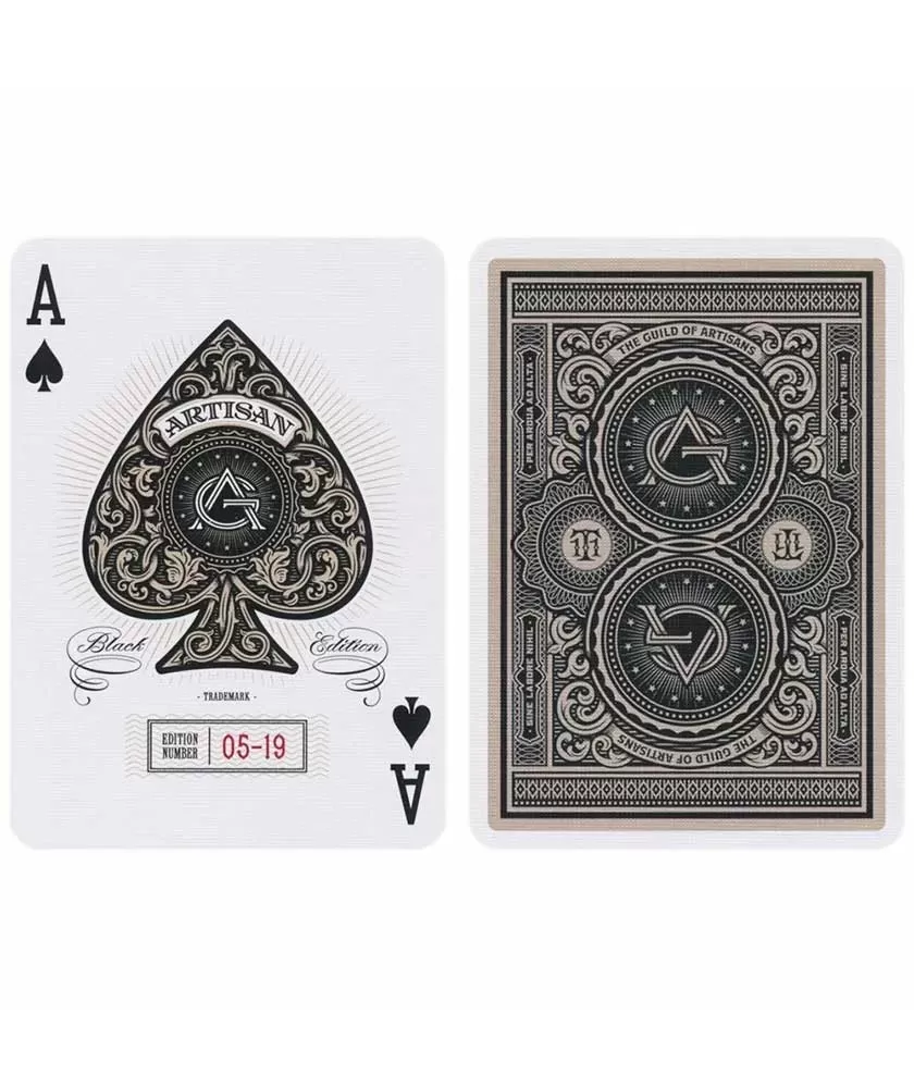 Designul distinctiv al setului Artisan se remarcă prin fundalul negru accentuat de detalii aurii elegante, conferind un aspect sofisticat și exclusivist. Pachetul este sigilat cu un timbru roșu care indică luna și anul imprimării, o notă autentică ce subliniază atenția la detalii și unicitatea fiecărei serii. Fabricat în SUA, acest set este un simbol al măiestriei și al pasiunii pentru cărțile de joc premium.