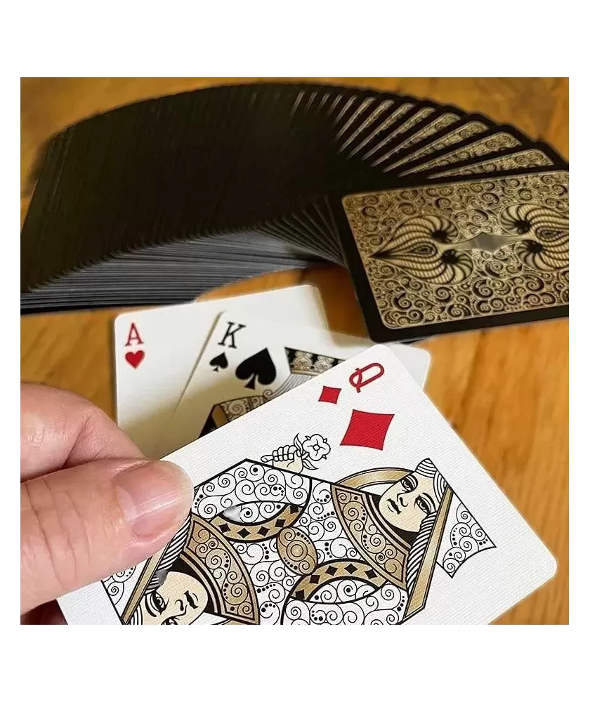 Bicycle Aureo Black – Playing Cards oferă o experiență unică pentru orice iubitor de jocuri de cărți, prin designul său sofisticat și calitatea superioară. Acest set emană eleganță, fiind inspirat din bogăția vizuală a Epocii Renașterii, cu accente aurii care adaugă un plus de rafinament fiecărei cărți.