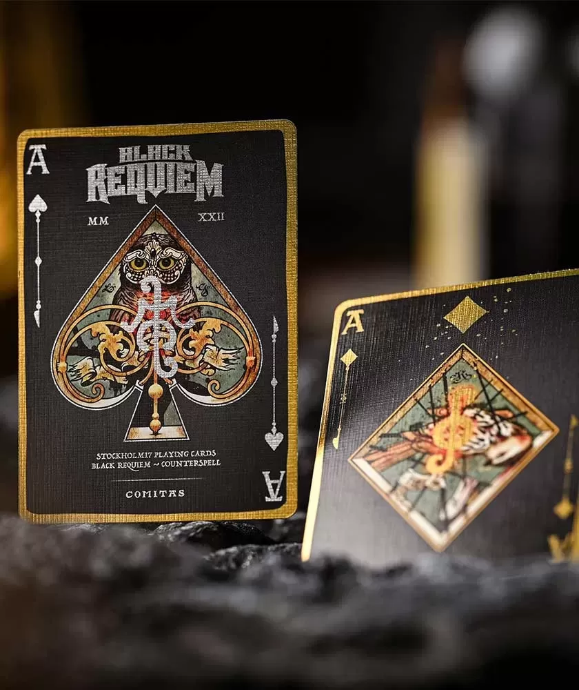 Pe lângă cărțile standard, setul include o carte Gaff cu 17 de romb și o carte suplimentară cu sigilii magice, fiind un produs exclusiv al brandului Stockholm17, cu fotografii realizate de Richard Arturo. Black Requiem Counterspell este alegerea perfectă pentru cei care apreciază designul artistic și calitatea superioară într-un format de cărți de joc.
