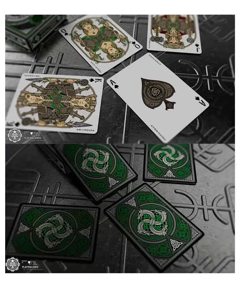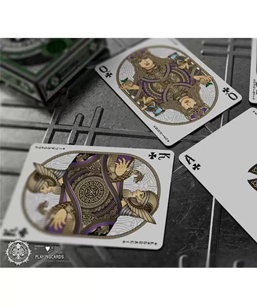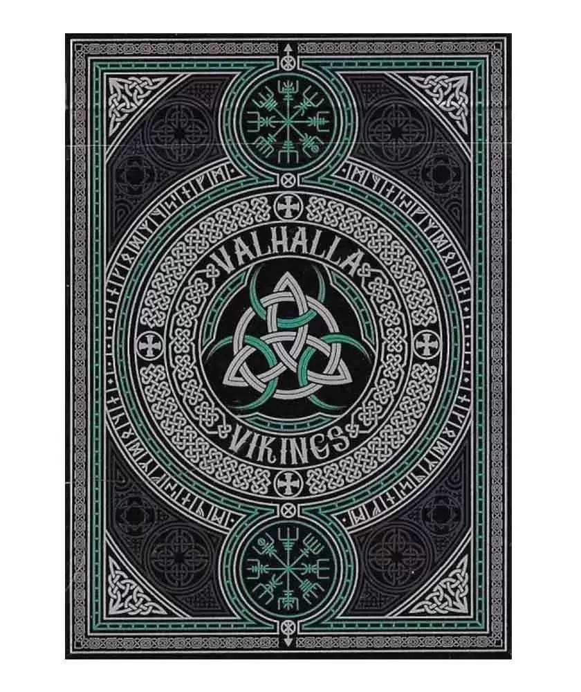 Setul Valhalla Viking Emerald Standard – Playing Cards oferă o experiență unică, combinând eleganța cu mitologia vikingă. Acest pachet premium este potrivit atât pentru jocuri tradiționale, cât și pentru trucuri de magie sau cardistry, datorită designului său distinct și a calității superioare. Designul spatelui este o compoziție simetrică ce evidențiază patru capete de dragon, simboluri ale puterii și vitejiei din cultura vikingă. Elementele artistice detaliate, inclusiv prezența zeilor nordici precum Odin, Thor sau Freya pe cărțile de curte, adaugă o notă de rafinament și autenticitate. Fabricate în SUA de Gamblers Warehouse, aceste cărți premium impresionează prin materiale de calitate și finisaje ce asigură durabilitate și o manevrabilitate optimă. Valhalla Viking Emerald Standard este alegerea ideală pentru colecționari și pasionați care apreciază o estetică bogată și o producție de top. Alege acest set pentru a aduce în jocurile tale o atmosferă mitologică și un design artistic de excepție, care inspiră creativitate și rafinament.